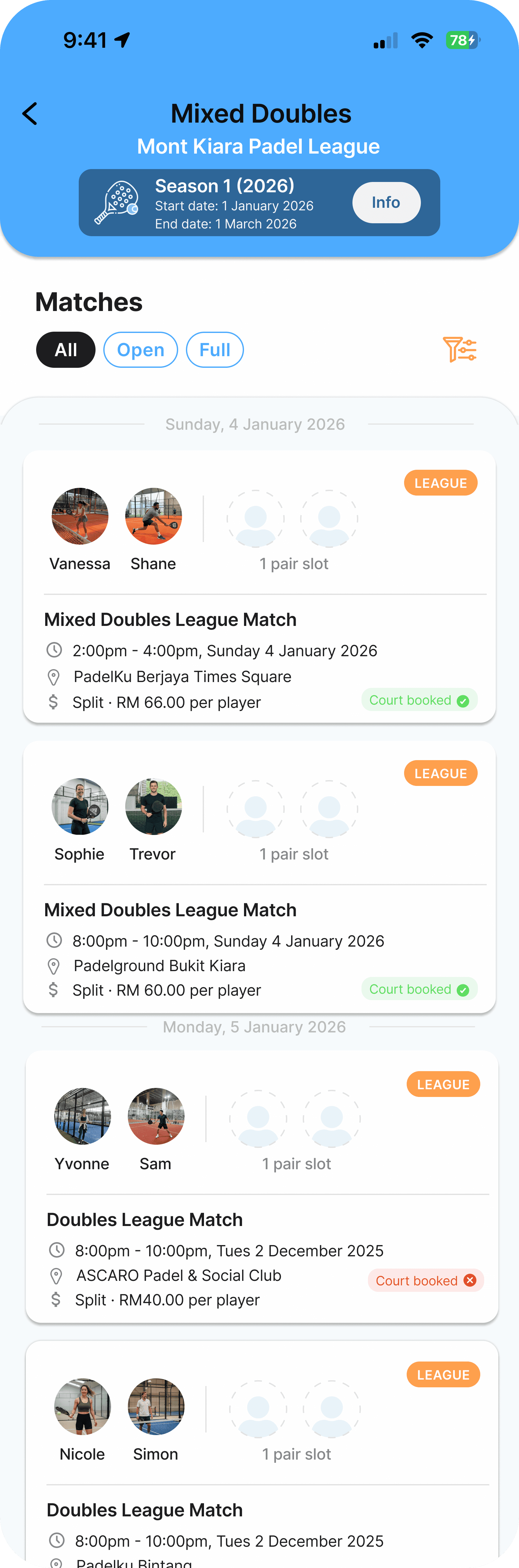 No fixed match times or assigned courts. Use the app to coordinate easily—propose times and courts, confirm with your opponent, and lock in your match.