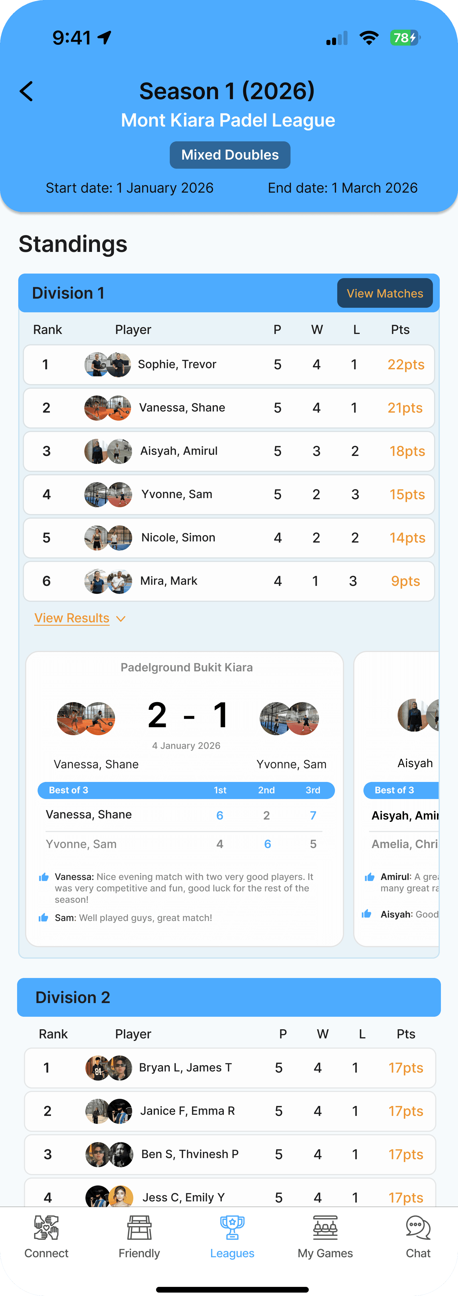 Record your match results and climb your division's live leaderboard. Earn badges and level up your game.