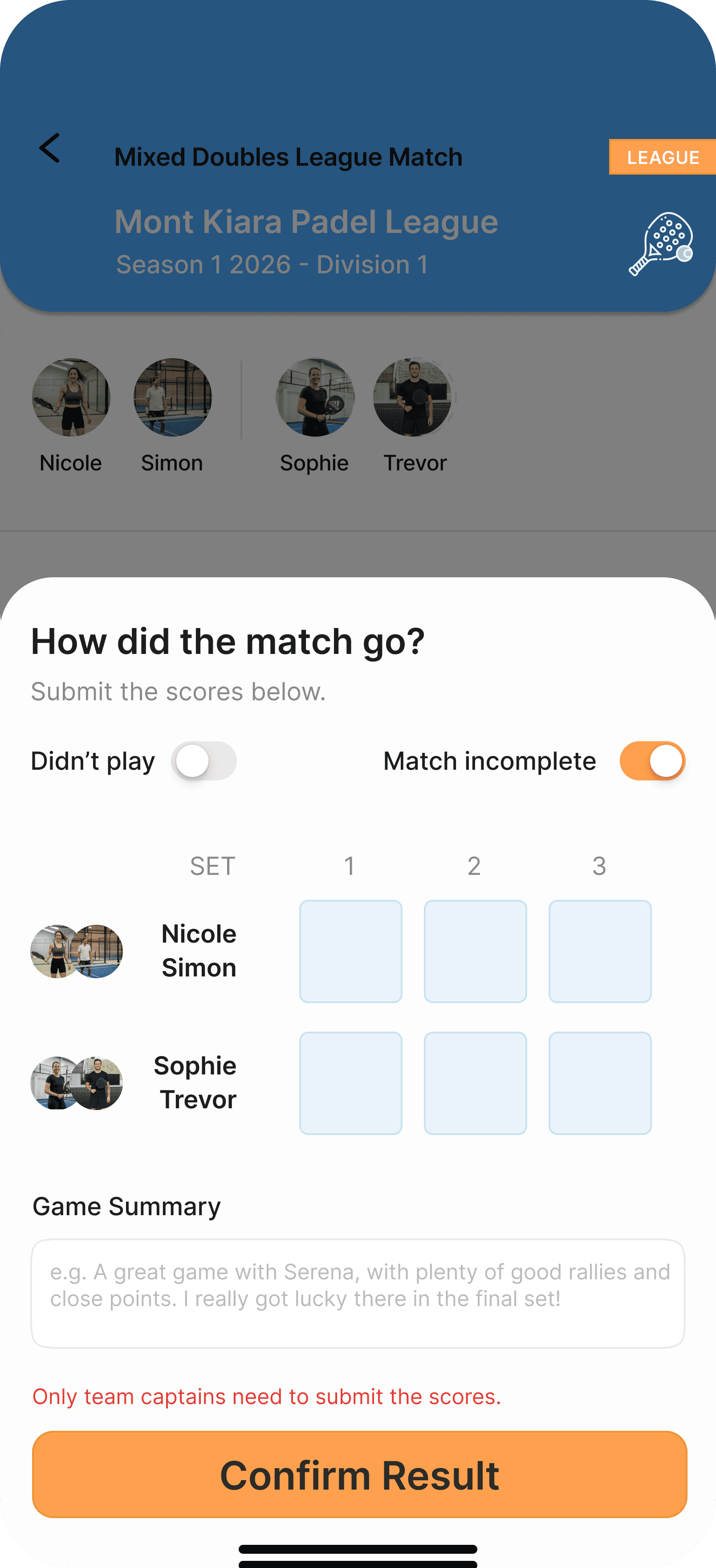 Meet your opponent on court and enjoy your match. After the game, submit or confirm your score in the app.